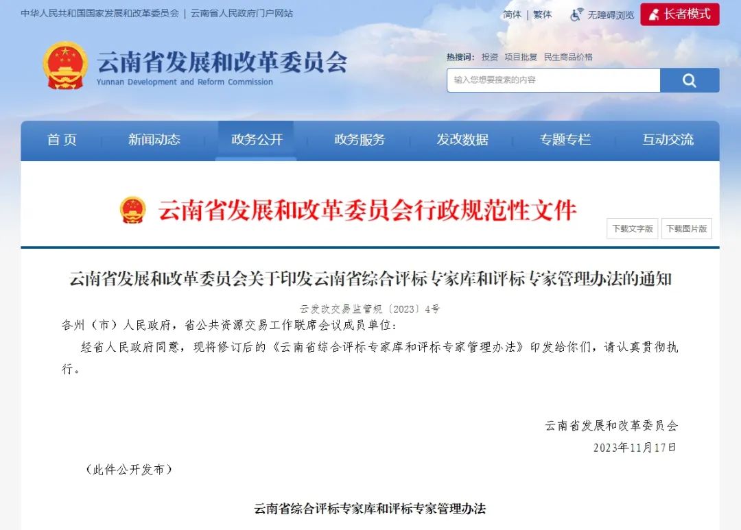 2023年11月17日,云南省发展改革委员会修订印发《云南省发展和改革委员会关于印发云南省综合评标专家库和评标专家管理办法的通知》(云发改交易监管规〔2023〕4号),新规将于2023年12月18日正式施行。