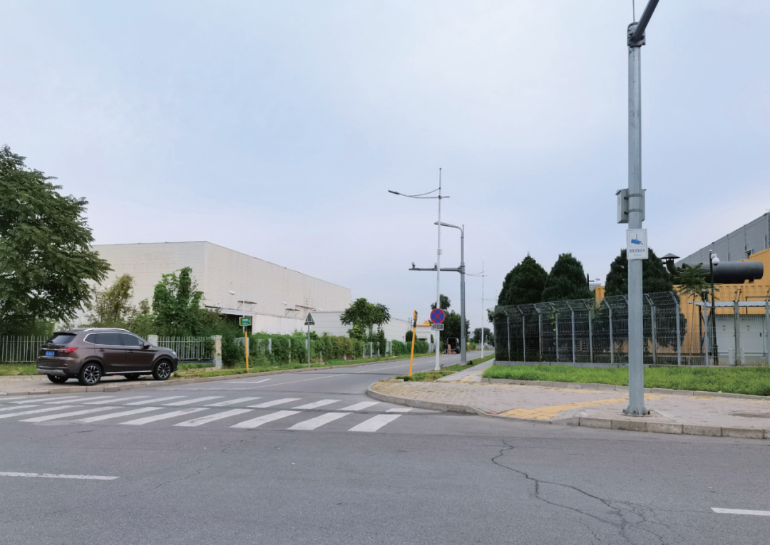 物流中心的运输车,是小型拖车,一个车头带很多车厢,像火车一样,在大园区内部道路上运行。它把大园区内的十二家工业园联系起来了。一年三百六十五天,工厂不停产,物流不停运。内部道路与市政道路是通着的,有很多路口,四通八达。为了物流拖车的安全运作,在各个十字路口均设置了保安岗和电动挡车杆,通过值班保安员人工操作,开启和关闭挡车杆,封闭一侧道路,让物流拖车安全通过。
