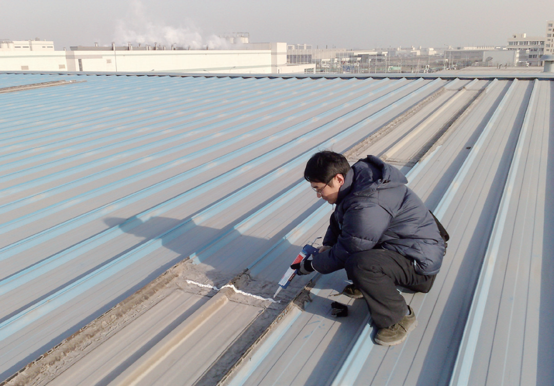 房子是钢结构,屋顶是彩钢板,从外面看,毫无问题,看不见漏水点。从室内看,因为有隔热保温层,漏水处不一定是屋顶的漏水点,即看不见实际漏水点在哪里,就要反复进行堵漏尝试,多次维修。有时候下大雨不漏,而下小雨却漏。这时最考验维修人员的分析判断能力。