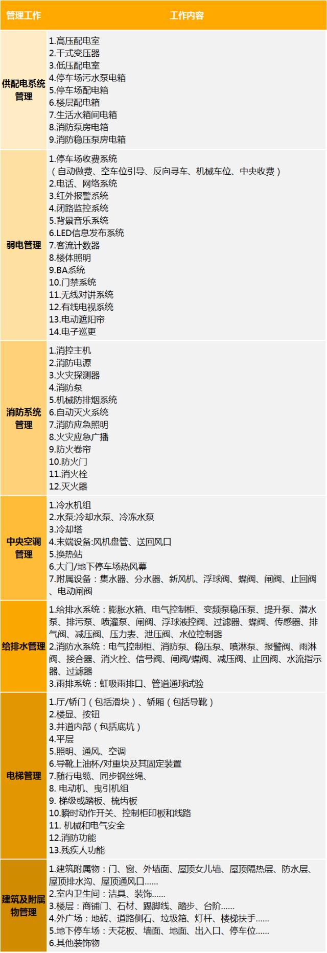 下面列举了部分运营期物业管理工作中的重点内容: