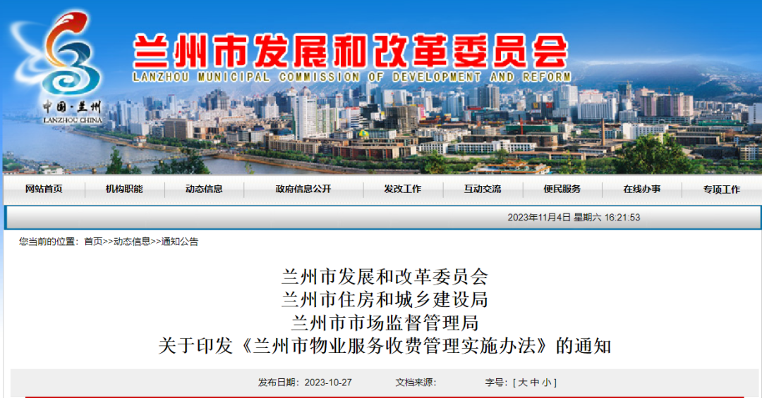 兰州市发改委发布了 《兰州市物业服务收费管理实施办法》 自2023年12月1日起实施 对物业收费标准 等相关服务做出规定 阿白整理了最新内容 ↓↓↓ 为规范物业服务收费行为,维护业主、物业使用人和物业服务人合法权益,根据《中华人民共和国民法典》《中华人民共和国价格法》《兰州市物业管理条例》《甘肃省定价目录》及省发展改革委、住建厅、市场监管局《关于进一步加强物业服务收费管理有关工作的通知》(甘发改价格〔2023〕5号)等法律法规和有关文件精神,结合本市实际,制定本办法。 本办法自2023年12月1日起实施,有效期5年。凡本办法之前的有关规定与本办法不符的,按本办法执行。国家、省市另有政策规定的从其规定。 第五条 物业服务收费可以采取包干制或者酬金制等形式合同约定。 包干制是指由业主向物业服务人支付固定物业服务费,盈亏均由物业服务人享有或者承担的物业服务计费方式。 酬金制是指在预收的物业服务资金中按约定比例或者约定数额提取酬金支付给物业服务人,其余全部用于物业服务合同约定的支出,结余或者不足均由业主享有或者承担的物业服务计费方式。 第六条 物业服务收费以合理成本费用为基础,结合物业服务内容和服务标准确定。 实行物业服务费用包干制的,物业服务费的构成包括物业服务成本、法定税费和物业服务人的利润。 实行物业服务费用酬金制的,预收的物业服务资金包括物业服务支出和物业服务人的酬金。 第七条 物业服务成本或者物业服务支出构成,一般包括以下部分: (一)管理服务人员的工资、社会保险和按规定提取的福利费等; (二)物业共用部位、共用设施设备的日常运行、维护等费用; (三)物业服务区域清洁卫生费用(不含垃圾处理费); (四)物业服务区域绿化养护费用; (五)物业服务区域秩序维护费用; (六)办公费用; (七)物业服务企业固定资产折旧; (八)物业共用部位、共用设施设备以及公众责任保险费用; (九)物业服务合同约定的其它费用。 物业管理区域内照明、景观、消防、安防、电梯等归属业主共有公共配套设施设备(不含二次供水加压调蓄、中央空调、供暖加压换热等设施设备)的用水、用电、设施设备维护保养费用计入物业服务费成本,不得单独收取。 物业共用部位、共用设施设备的大修、中修和更新、改造费用,应当通过公共收益或专项维修资金予以列支,不得计入物业服务成本或者物业服务支出。 在国家规定的质量保修范围和保修期内的物业共用部位、共用设施设备维修和更换,应由开发建设单位负责,不得动用公共收益和专项维修资金或者由业主承担。 第十八条 物业服务费按月收取,经业主同意,可按季或半年进行预收,最长预收期限不得超过十二个月。 第十七条