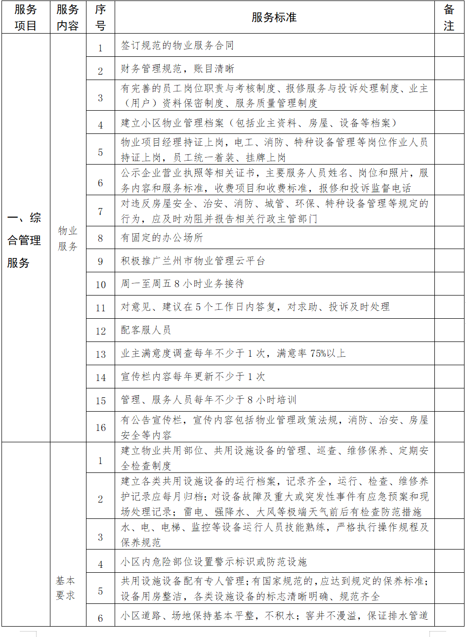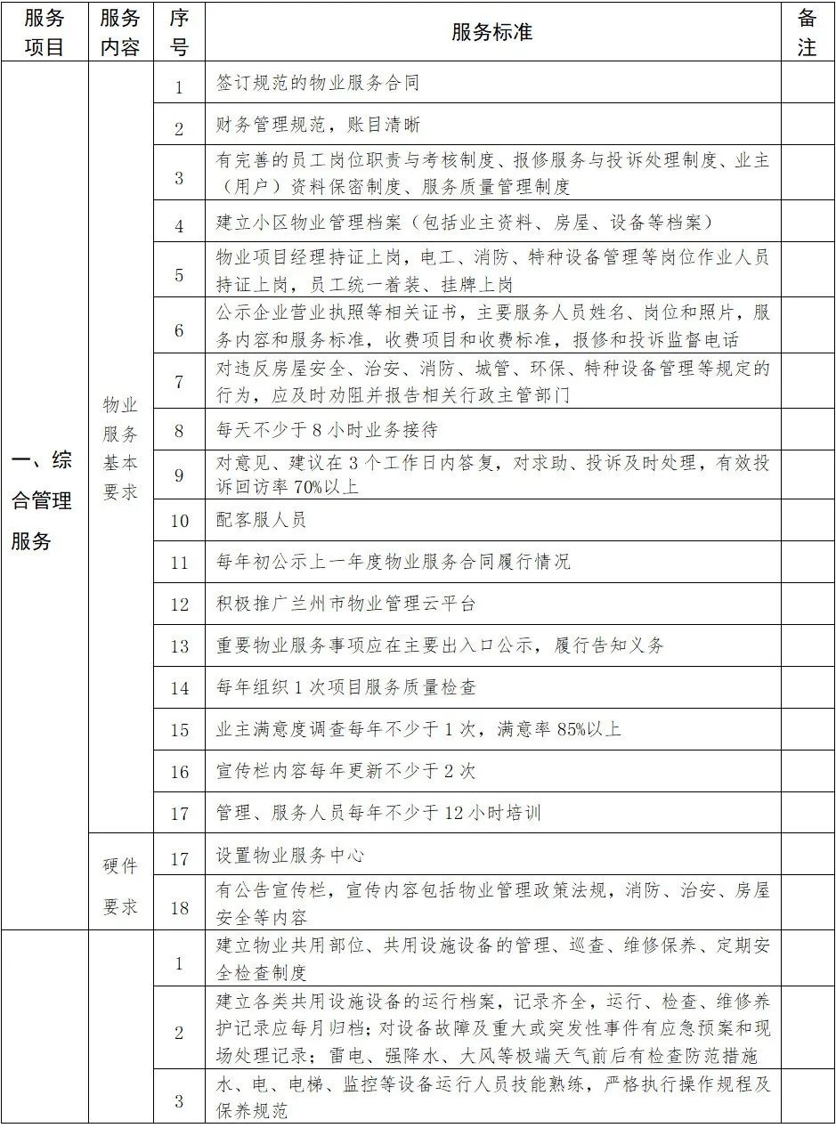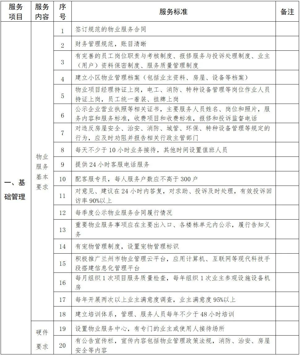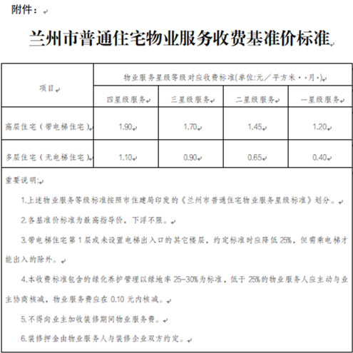 本办法适用于本市主城四区(城关区、七里河区、西固区、安宁区)行政区域内的物业服务收费行为及其监督管理。 红古区、皋兰县、永登县、榆中县可参照本办法执行,或者根据本区域实际制定具体实施办法。 上述收费标准中提到的 《兰州市普通住宅物业服务星级标准》 阿白也给大家整理好啦 ↓↓↓ ↓上下滑动屏幕查看↓ ↓上下滑动屏幕查看↓ ↓上下滑动屏幕查看↓ ↓上下滑动屏幕查看↓
