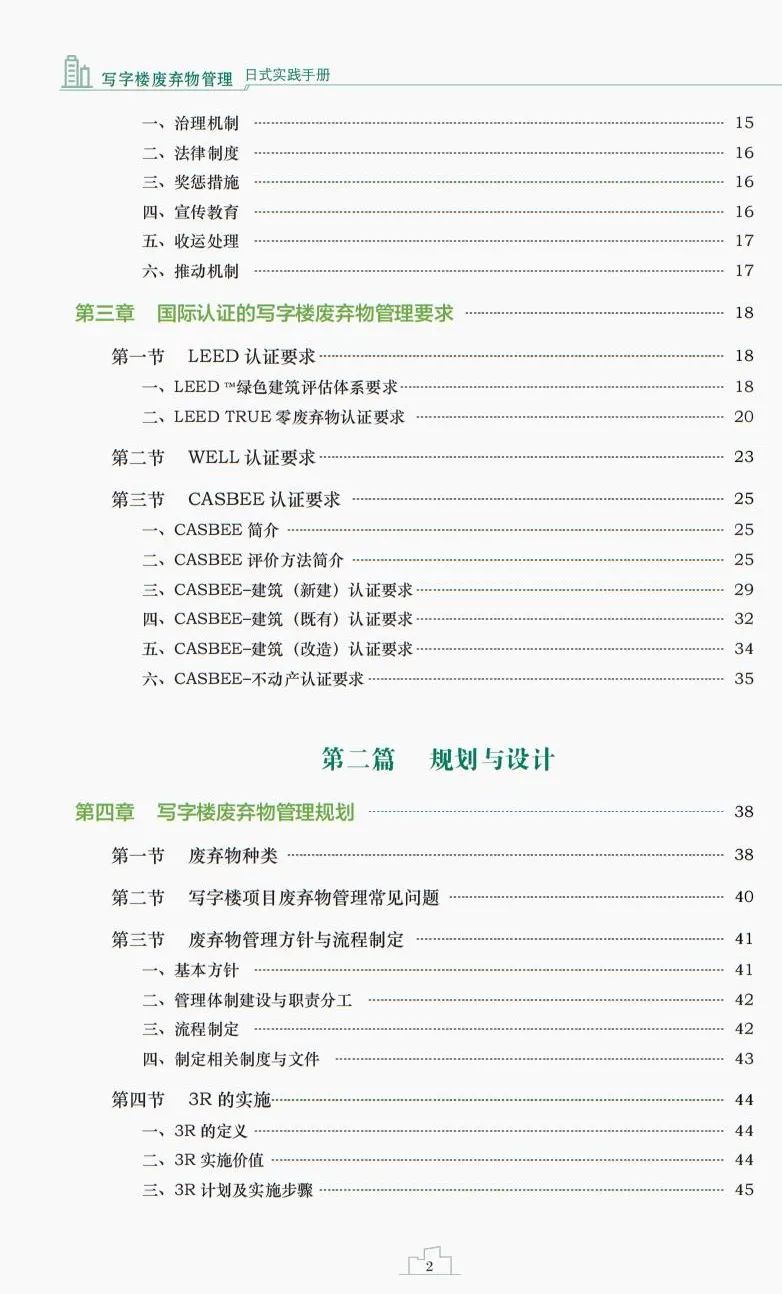 《手册》将在系统分析与梳理日本废弃物管理体系与方法以及日本废弃物管理的发展历程的基础上,针对写字楼的特点,涵盖写字楼废弃物管理规划的制定、租户沟通与管理、废弃物投放与存放场地/容器/人员/设备与器具等的规划、投放/收集/搬运/分拣/计量/清运的作业流程、餐饮/商业/装修等垃圾的管理、劳动安全卫生以及质量管理/5S管理等方面的内容。此外还将介绍废弃物管理的相关法律法规以及LEED等国际认证之间的关系等内容,具体目录如下所示。