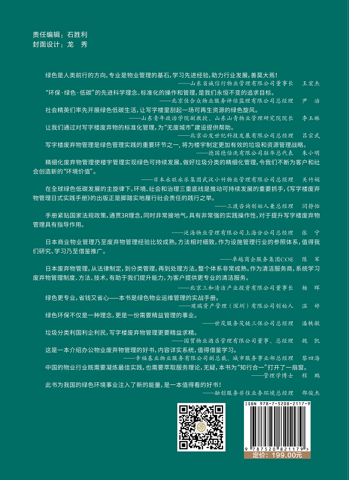 本书是中日合作集体智慧的结晶。日本设施管理协会 F M 战略委员会安蘓秀德委员指导编写,主编之一的高彦先生常驻日本工作,部分编委来自两家日资背景企业,一家日本物业环境用品公司提供了技术和图片支持,使本书具有鲜明的日式特色。国内编委既有高校教授,又有头部企业高管和物业管理专家,清洁企业与垃圾分类企业高管,还有欧美清洁专家。确保了手册建立在国际视角上的系统性、实用性和严谨性,既有方法论,又具可操作性。