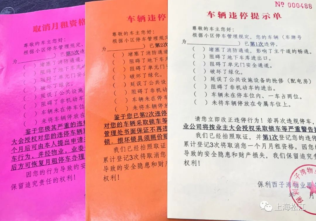 第二次违停:上锁。开锁必须由物业、业委会、居委会三方签字确认后才能开锁放行,造成损失及一切后果由违停车主自行承担。
