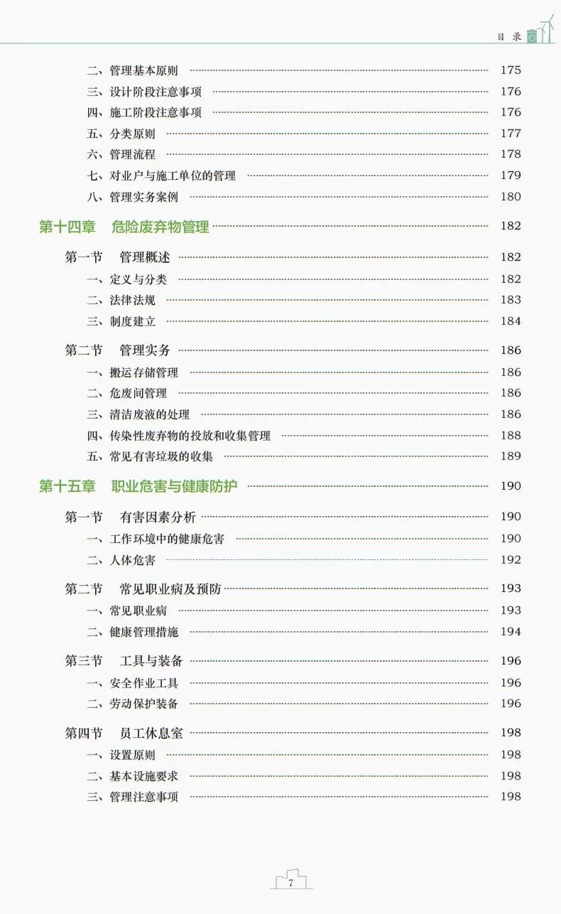《手册》将在系统分析与梳理日本废弃物管理体系与方法以及日本废弃物管理的发展历程的基础上,针对写字楼的特点,涵盖写字楼废弃物管理规划的制定、租户沟通与管理、废弃物投放与存放场地/容器/人员/设备与器具等的规划、投放/收集/搬运/分拣/计量/清运的作业流程、餐饮/商业/装修等垃圾的管理、劳动安全卫生以及质量管理/5S管理等方面的内容。此外还将介绍废弃物管理的相关法律法规以及LEED等国际认证之间的关系等内容,具体目录如下所示。