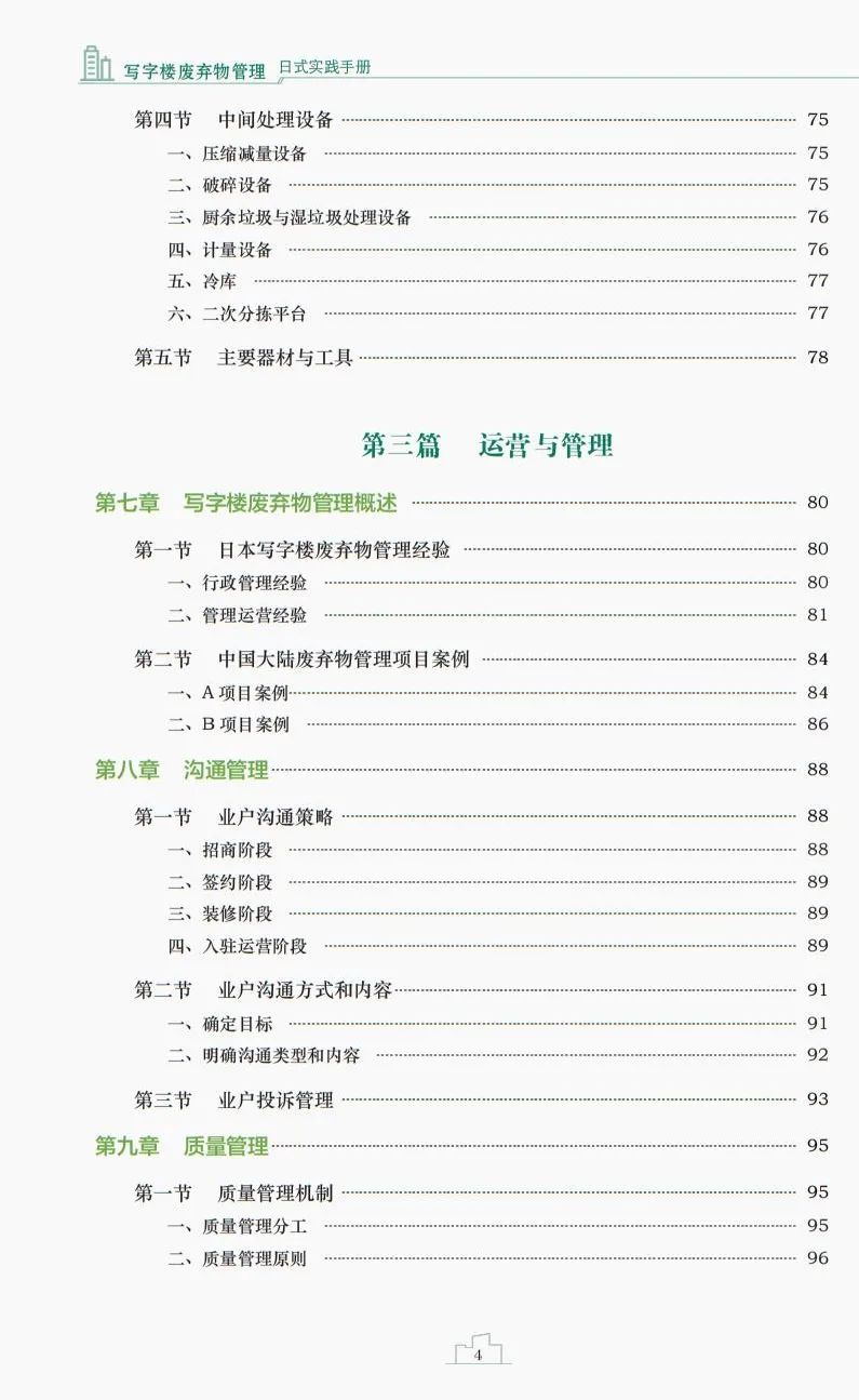 《手册》将在系统分析与梳理日本废弃物管理体系与方法以及日本废弃物管理的发展历程的基础上,针对写字楼的特点,涵盖写字楼废弃物管理规划的制定、租户沟通与管理、废弃物投放与存放场地/容器/人员/设备与器具等的规划、投放/收集/搬运/分拣/计量/清运的作业流程、餐饮/商业/装修等垃圾的管理、劳动安全卫生以及质量管理/5S管理等方面的内容。此外还将介绍废弃物管理的相关法律法规以及LEED等国际认证之间的关系等内容,具体目录如下所示。