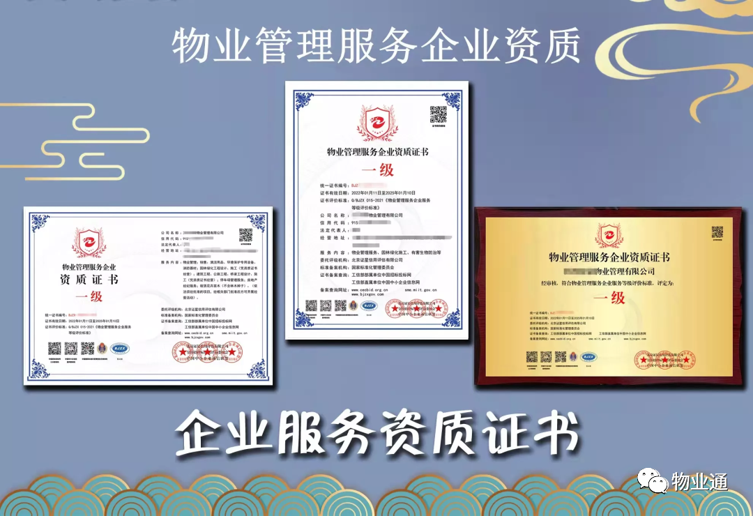 各类企业资质证书:物业管理服务企业资质证书(一级)、垃圾分类处理服务企业资质证书(甲级)、有害生物防治服务企业资质证书(甲级)、有害生物防治四害消杀服务企业资质证书(甲级)等