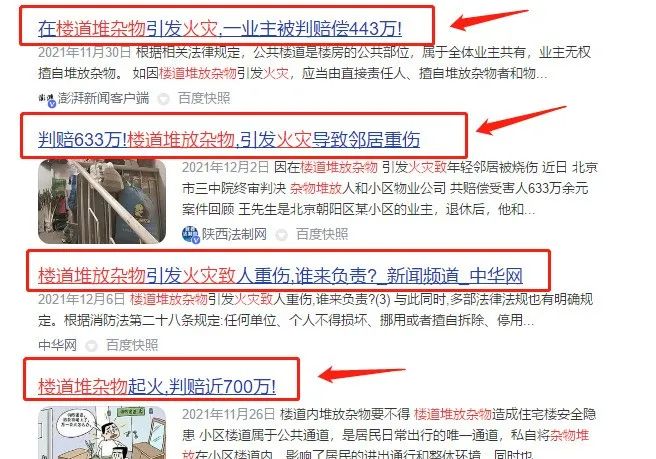 我是您的老朋友——楼梯间。当您刚入新居,我整洁明亮,空间宽敞! 物业工作人员每天来看我,为我扫去身上的尘土,夸我干净利落! 后来,您的东西越来越多,我快喘不过气来了,邻居通过时一脸嫌弃和愤慨! 就连您的家门口、管道井都成了储物间! 物业工作人员几次来劝阻,引发了您和他们的争吵! 他们搬走杂物,您继续堆放,就像一场没有硝烟的战争! 终于,可怕的事情发生了! 我被烧成了废墟,甚至烧伤了逃生的邻居。 邻居重伤,您被判决赔偿,赔偿金额大的无法想象! PART 01 楼道堆积杂物可能引起火灾 楼道堆放的杂物多为木制品、棉织品、纸制品等等,都是可燃物,稍遇明火就可能引起火灾。楼道是居民行走的通道,抽烟随便乱扔烟头者有之,儿童玩火、燃放爆竹者有之,这些都很容易引起火灾事故的发生。 PART 02 楼道堆积杂物影响通行 小区楼道属于公共消防通道,是楼内住户日常出行的唯一通道,部分住户将杂物堆放在小区楼道内,影响了居民的进出通行和整体环境,同时也存在安全隐患。当发生地震、火灾等自然灾害的时候,将严重影响他人逃生。 PART 03 楼道堆积杂物影响楼道清洁 楼道里堆满了杂物,占据、遮挡了地面以及墙壁的很大一部分空间,导致保洁人员无法对这里的环境卫生进行清洁,久而久之,堆放杂物的地方也就成了卫生清理上的“死角”,脏乱不堪。 真 实 案 例 楼道堆杂物 3岁女童攀爬窗户坠亡 2021年7月15号上午,在瘦西湖福苑小区发生了一起悲剧。一名3岁的女童因家中无人,竟通过攀爬楼道杂物到十楼窗户口,不幸坠楼身亡。 孩子父亲认为,孩子之死与楼道邻居堆放的杂物脱不开干系。原来,孩子是从公共楼道的窗户爬出去坠亡的,而一米多高的窗台旁,则摆放着邻居家的缝纫机、凳子以及一辆自行车。 楼道杂物起火 大爷烧成火人 2018年,四川资阳市雁江区一小区1楼楼道内杂物起火,整个民房为7层。消防出动7辆消防车、35人赶到现场将火扑灭,并疏散出24名被困人员。火灾造成包括老大爷在内的8人受伤。 电动车楼道内充电起火 引燃楼道杂物致人死亡 2016年7月22日12时,阜南县某小区A栋三单元发生火灾,烧损电瓶车、杂物等,并造成居住在该单元3A室的住户马某死亡。 消防部门认定起火原因为电瓶车电线短路引燃可燃物着火。医院诊断证明书确认:马某为呼吸道烧伤、重度烧伤,经抢救无效死亡。 楼梯间杂物起火 花季少女被烧伤致十级伤残 2014年8月12日上午,如东县某小区2号楼3单元505室的16岁少女姗姗,因邻居业主在楼梯间堆放杂物、遗留火种引发火灾导致烧伤,致十级伤残。 楼道起火母女逃生 被杂物绊倒烧成重伤 2013年,大连西岗区某小区,发生了一起特大火灾,着火的是一楼单元门楼道里的杂物,一女孩儿在逃生过程中被杂物绊倒,掉入火海。 楼道禁止堆放杂物的法律依据 《民法典》第二百八十六条:业主应当遵守法律、法规以及管理规约。业主大会或者业主委员会,对任意弃置垃圾、排放污染物或者噪声、违反规定饲养动物、违章搭建、侵占通道、拒付物业费等损害他人合法权益的行为,有权依照法律、法规以及管理规约,请求行为人停止侵害、排除妨碍、消除危险、恢复原状、赔偿损失。 行为人拒不履行相关义务的,有关当事人可以向有关行政主管部门投诉,有关行政主管部门应当依法处理。 《高层民用建筑消防安全管理规定》第三章第二十八条规定:高层民用建筑的疏散通道、安全出口应当保持畅通,禁止堆放物品、锁闭出口、设置障碍物。禁止圈占、遮挡消火栓,禁止在消火栓箱内堆放杂物,禁止在防火卷帘下堆放物品。 《高层民用建筑消防安全管理规定》第三章第三十七条规定:禁止在高层民用建筑公共门厅、疏散走道、楼梯间、安全出口停放电动自行车或者为电动自行车充电。违反此规定的,由消防救援机构责令改正,对非经营性单位和个人处500元以上1000元以下罚款。 《消防法》第六十条第三款:“占用、堵塞、封闭疏散通道、安全出口或者有其他妨碍安全疏散行为的,对个人处警告或者五百元以下罚款”。 《消防法》第二十八条:“任何单位、个人不得损坏、挪用或者擅自拆除、停用消防设施、器材,不得埋压、圈占、遮挡消火栓或者占用防火间距,不得占用、堵塞、封闭疏散通道、安全出口、消防车通道。人员密集场所的门窗不得设置影响逃生和灭火救援的障碍物。” 《最高人民法院关于审理建筑物区分所有权纠纷案件具体应用法律若干问题的解释》第三条:“楼梯通道,所有权属于全体业主。个别业主私自将楼梯通道用于自己堆放杂物,明显是化共有为私有,也是对其他业主共有权的侵害”。 物业紧急通知: 亲爱的小区业主们 为创造美好舒适的生活环境, 保证您和他人的生命财产安全, 请不要在公共楼道区域内堆放杂物; 请不要在楼道内储存 易燃、可燃物、易引发火灾物品; 请不要在楼道内违规停放电动车; 请不要在楼道内乱堆乱放生活垃圾; 请不要在楼道内随意拉接临时电线、 违章用电; 请不要损坏、占用、拆除、挪用 消防设施和器材。 美好园区,需要我们共同守候! 感谢您的理解、配合与支持!