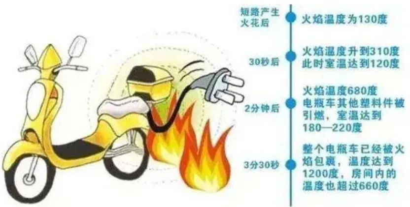 楼道内的电动自行车燃烧后危险性成倍增加,因电动自行车车身、围挡、坐垫普遍采用高分子可燃材料,起火后90秒温度可达200摄氏度,120秒后电动车开始爆炸,浓烟将会笼罩整个楼道,会释放大量有毒烟气,并迅速蔓延,短时间内就会致人中毒窒息死亡。