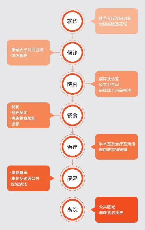 医院后勤服务的目标是为患者做到从就诊到离院的各个接触点的全流程服务。从患者进入门诊大厅就诊到入院治疗,再到恢复健康出院,整个过程中的各个场所、触点,都在服务范围内。(图1)