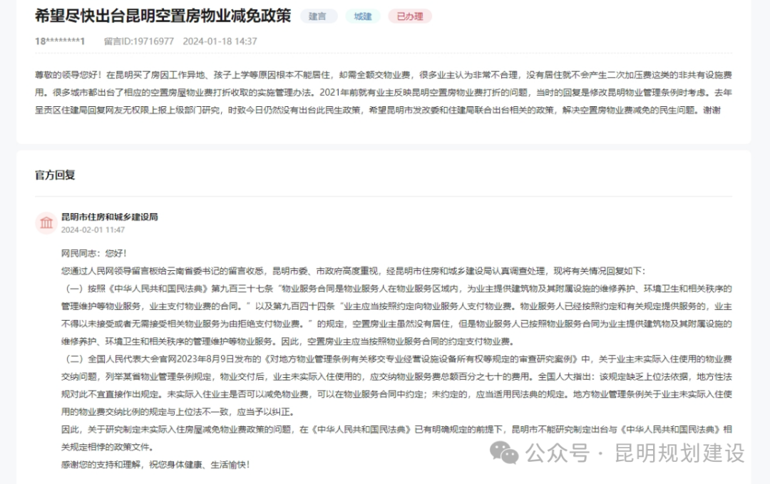 网友: 昆明市住房和城乡建设局: (一)按照《中华人民共和国民法典》第九百三十七条“物业服务合同是物业服务人在物业服务区域内,为业主提供建筑物及其附属设施的维修养护、环境卫生和相关秩序的管理维护等物业服务,业主支付物业费的合同”以及第九百四十四条“业主应当按照约定向物业服务人支付物业费。 物业服务人已经按照约定和有关规定提供服务的,业主不得以未接受或者无需接受相关物业服务为由拒绝支付物业费”的规定,空置房业主虽然没有居住,但是物业服务人已按照物业服务合同为业主提供建筑物及其附属设施的维修养护、环境卫生和相关秩序的管理维护等物业服务。 因此,空置房业主应当按照物业服务合同的约定支付物业费。 (二)全国人民代表大会官网2023年8月9日发布的《对地方物业管理条例有关移交专业经营设施设备所有权等规定的审查研究案例》中,关于业主未实际入住使用的物业费交纳问题,列举某省物业管理条例规定,物业交付后,业主未实际入住使用的,应交纳物业服务费总额百分之七十的费用。 全国人大指出:该规定缺乏上位法依据,地方性法规对此不宜直接作出规定。未实际入住业主是否可以减免物业费,可以在物业服务合同中约定;未约定的,应当适用民法典的规定。地方物业管理条例关于业主未实际入住使用的物业费缴纳比例的规定与上位法不一致,应当予以纠正。