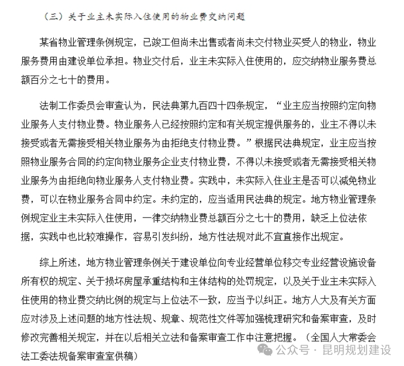 据了解,2023年8月中国人大网发布了《对地方物业管理条例有关移交专业经营设施设备所有权等规定的审查研究案例》。
